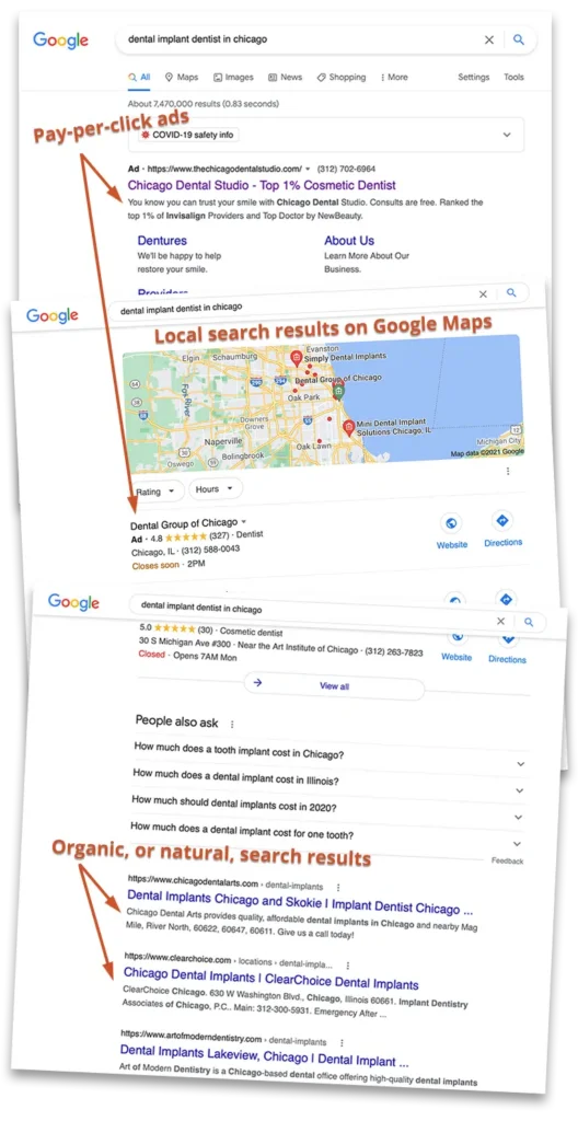 Dental implant marketing has become highly competitive. Search for “dental implants near me” and you’ll find crowded results pages filled with both paid ads and organic listings—especially in metropolitan areas.